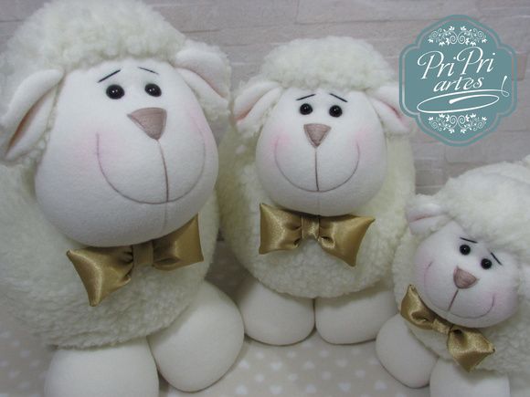 Ovelhas ou Cordeiros de pelúcia com gravatinha em tecido para o cordeiro e laço cetim e pérolas para ovelha, com guizo para ambos.