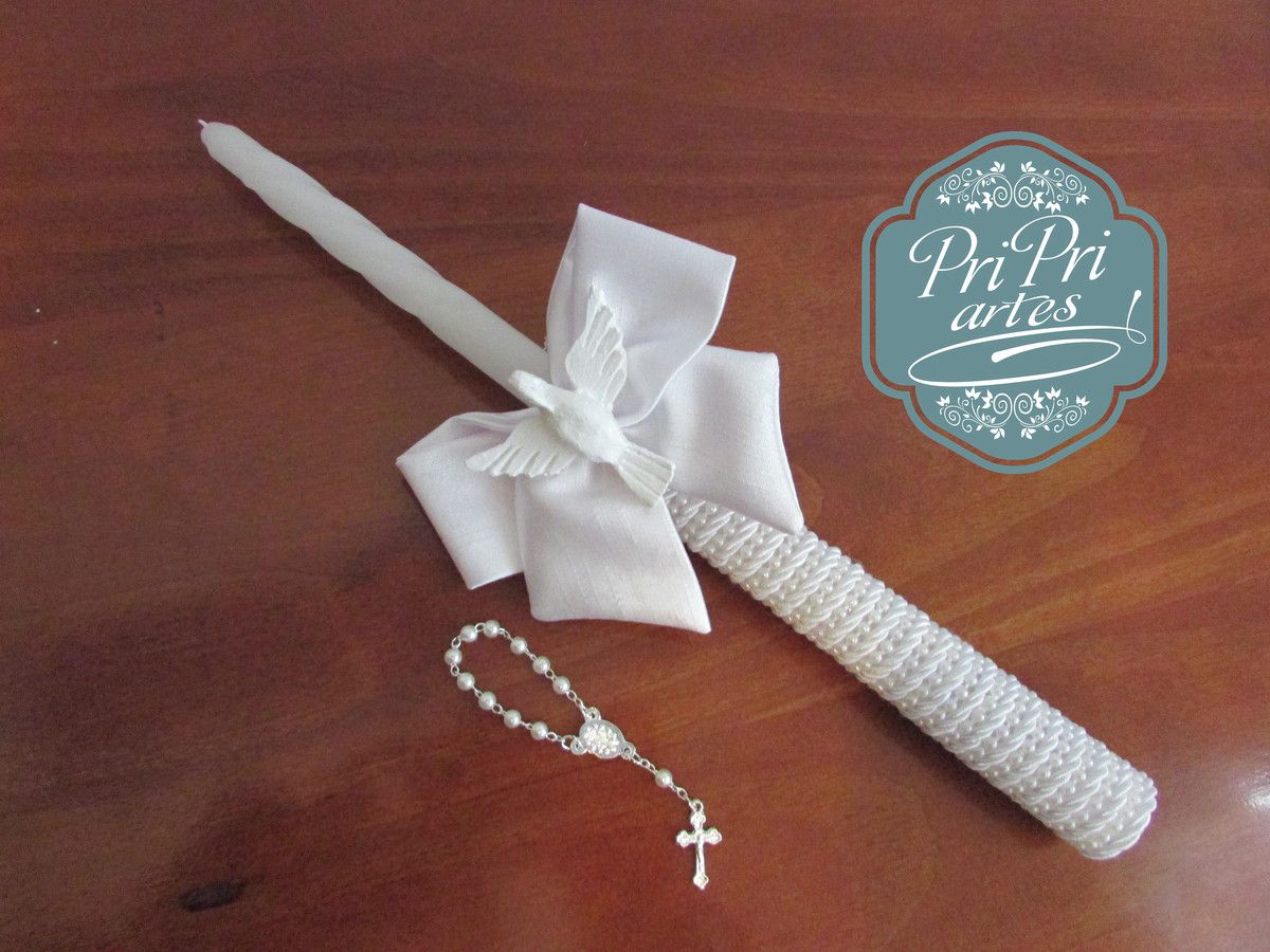 Vela de batismo decorada com pérola, laço e aplique pombo